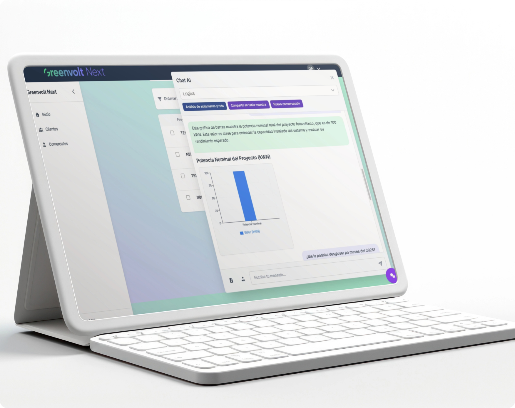 La solución moderniza completamente el flujo comercial y técnico, desde la creación de un proyecto hasta su envío al CRM, integrando un chatbot inteligente que interpreta datos, ejecuta cálculos y guía al equipo en tiempo real.
